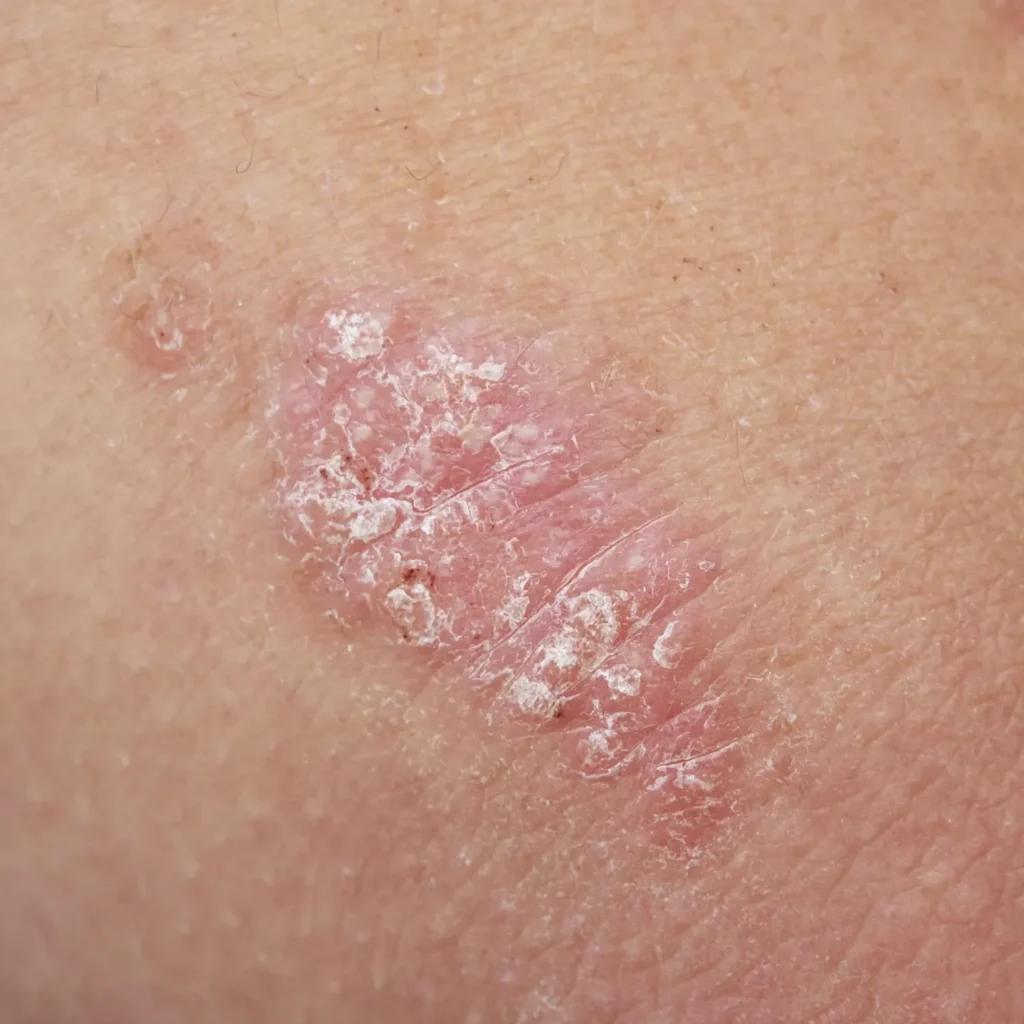 Psoriasis Treatment Information Psoriasis is a skin condition that creates red patches of skin with white, flaky scales. It most